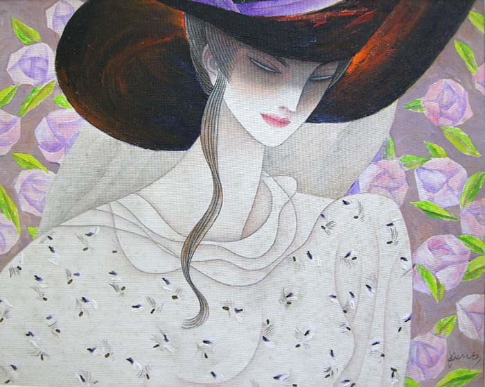 这幅典雅俊美的美女图,就是冯长江的经典手笔,该画在色彩处理上独到,他把东方传统的绘画形式融入西方绘画色彩元素,它与传统的中国重彩工笔有所不同,它大胆舍弃高贵中的淡雅,突出浓重中的唯美,追求色彩肿的稳重,讲究艳丽中的宁静,艺术风格独一无二,线条和色块的结合,让我们看到了一个不一样的艺术效果。